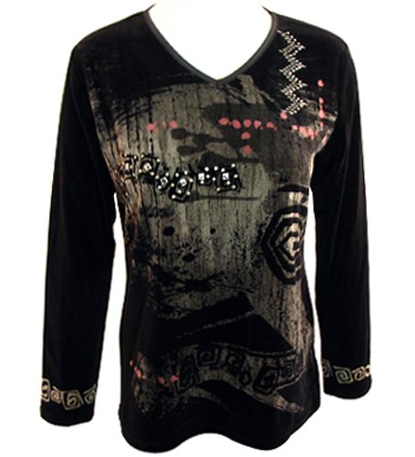 Cheap Katina Marie - Mona Lisa Casual "Abstract" Long Sleeve, Rhinestone Studded, Pre-Washed, Printed, V-Neck Velour Top - Black Review