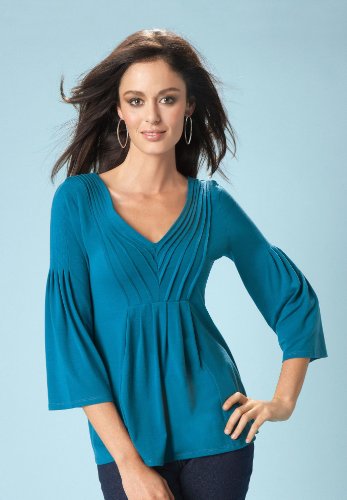 This gorgeous top is just what you wish for. Imported.With extra special details in an ultra-soft knitPleat trim along the V-neckline, empire waist seam and 3/4-length sleevesPolyester/spandex; Machine washPetites 23' long