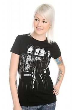 This fitted tee features a cartoon-like image of the band on the front and an ETF logo on the back.