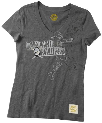 For great throwback Raiders style and supremely comfortable wear, check out this Oakland Raiders Retro Sport Women's The Catch V-Neck T-Shirt from Retro Sport Features mixed graphic application consisting of foil, water, based ink and thin yarn stitches for an incredibley detailed look that you wont find anywhere else.